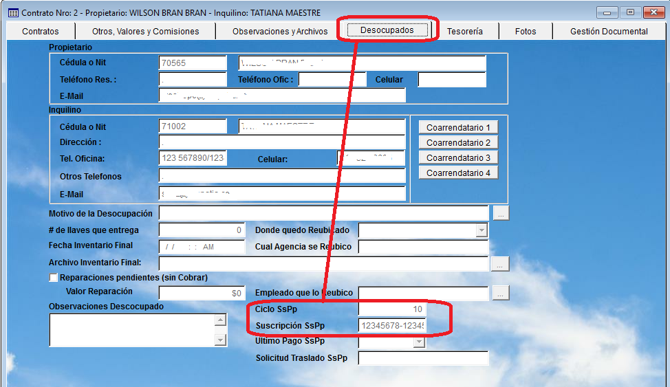 - Se corrige error en la grabación de los coarrendatarios cuando se no se van a grabar el representante legal, porque el coarrendatario es una persona natural. Esto funciona cuando el deudor solidario es una empresa y requiere que tenga representante legal asignado.