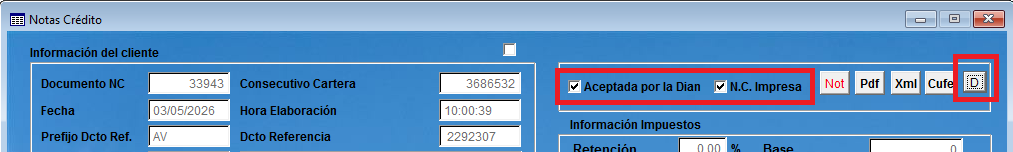 Formulario Notas Crédito: Se permite marcar o desmarcar notas crédito enviadas a la DIAN. Presionando el Botón D...