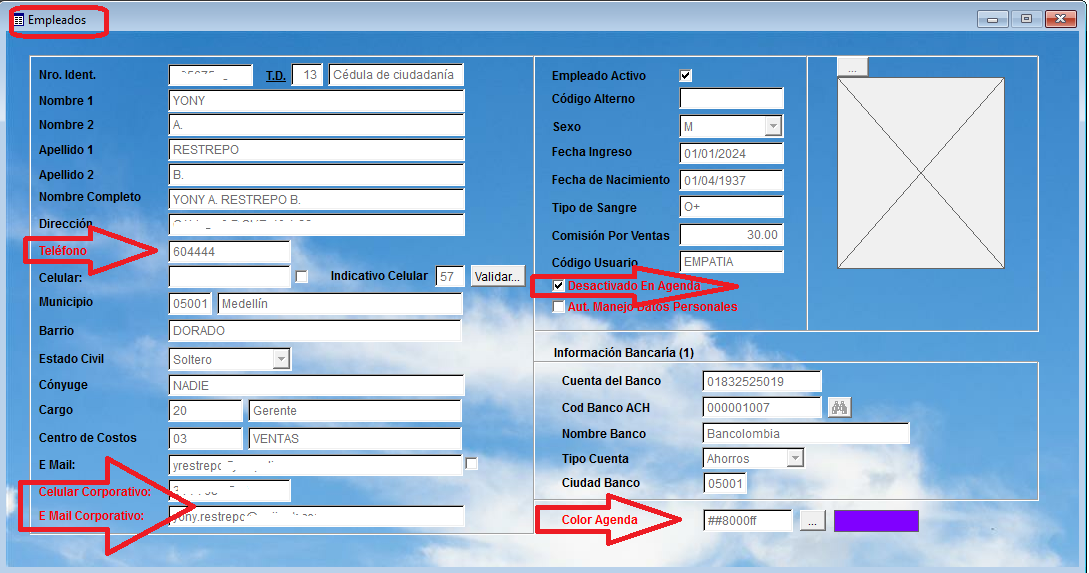 Los campos Celular Corporativo, Email Corporativo, Desactivado en Agenda, Color de Agenda y Teléfono de Oficina pueden ser digitados tanto desde Softinm local como desde Softinm web. Por lo tanto, cuando estos campos presentan diferencias entre ambas aplicaciones —especialmente cuando se modifican desde Softinm web—, al ingresar posteriormente por Softinm local se notifica que hubo modificaciones y que queda bajo la responsabilidad del usuario revisar, modificar y guardar los cambios correspondientes.