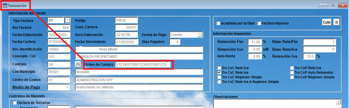 Se amplía el campo de orden de compra de 15 a 25 de ancho