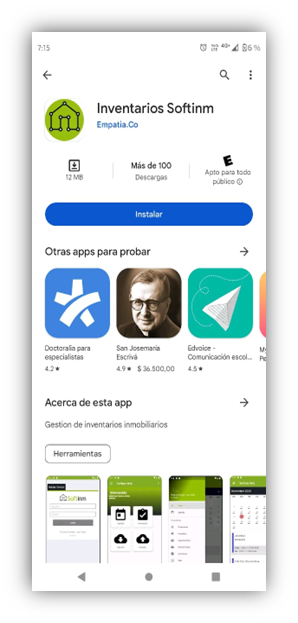 Después de crear la plantilla de inventarios en Softinm Web, debe instalar la aplicación de Softinm Inventarios en su dispositivo móvil, ya sea un celular o una Tablet. Siga estos pasos: