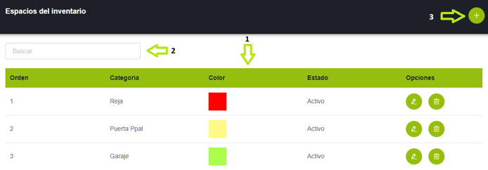 - Tabla en donde se muestran los espacios creados, inicialmente vienen unos espacios por defecto, pero estos los pueden eliminar o modificar a su gusto, el color del espacio se va a ver reflejado en la App de inventarios con el fin de ayudar en la navegación dentro del inventario. (NOTA: el espacio no se puede eliminar una vez se haya usado en un inventario).