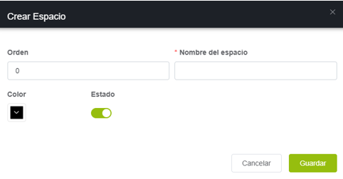 El orden sirve para ubicar el espacio más relevante de primero en la app y así facilitar el acceso a este. el color damos clic en el recuadro y abre un recuadro con todos los colores que puede agregar (no te olvides de darle confirmar para que tome el color) y por último el recuadro de nombre donde vamos a ingresar el espacio nuevo y guardar