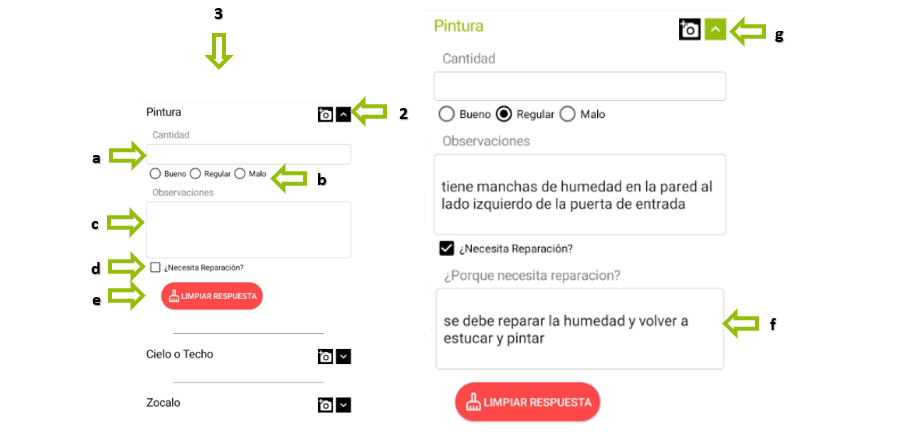 d. Cuando la calificación es regular o mala, indica que se requiere una reparación o mantenimiento. Al seleccionar este recuadro, se abrirá un campo para realizar anotaciones al respecto.