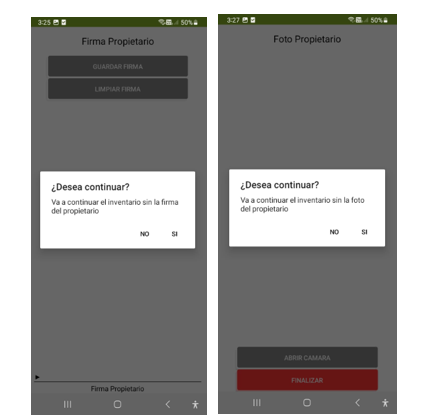 · Firma Propietario: Esta firma no es obligatoria. Se puede guardar la firma sin necesidad de que el propietario firme físicamente. Se presentará una pregunta para confirmar si se desea continuar el inventario sin la firma del propietario: