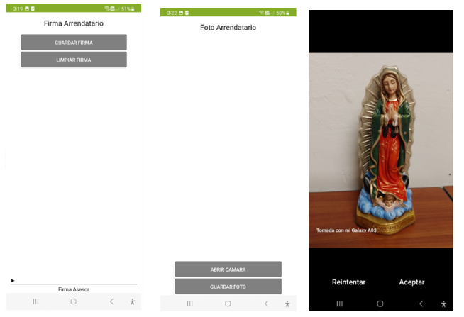 - ABRIR CÁMARA: Para tomar la foto del propietario. Se puede aceptar la foto o reintentar si no es satisfactoria.