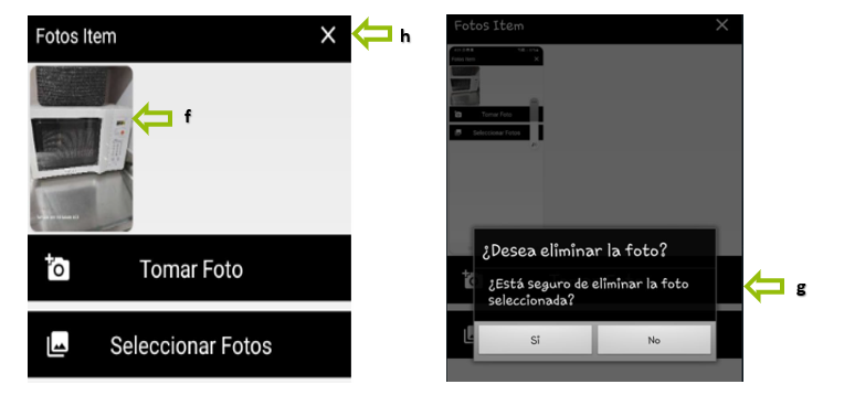 f. Para eliminar las fotos que no necesitamos subir al ítem, por razones como estar desenfocadas o duplicadas, simplemente mantén presionada la foto que deseas eliminar.