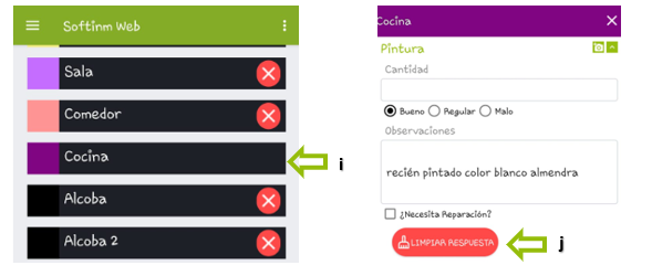 f. En este espacio se puede especificar cuál es la reparación o mantenimiento necesario. Más adelante, en el inventario que se muestra en el dispositivo antes de firmar, estas anotaciones aparecerán en letra de color rojo para distinguirlas de las observaciones normales. En el inventario descargado en Softinm Web, ya sea para imprimirlo, enviarlo por correo o visualizarlo en la zona de cliente de la página web, estas necesidades se presentarán en un campo destacado en la parte superior para que el propietario tenga conocimiento de estas prioridades y pueda garantizar las óptimas condiciones del inmueble.