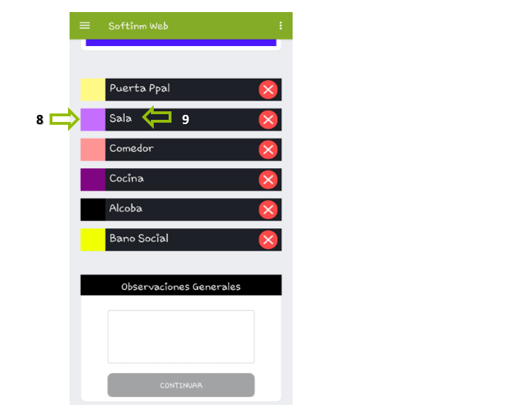 8. Para ingresar y diligenciar el espacio, simplemente toque el color o la palabra correspondiente.